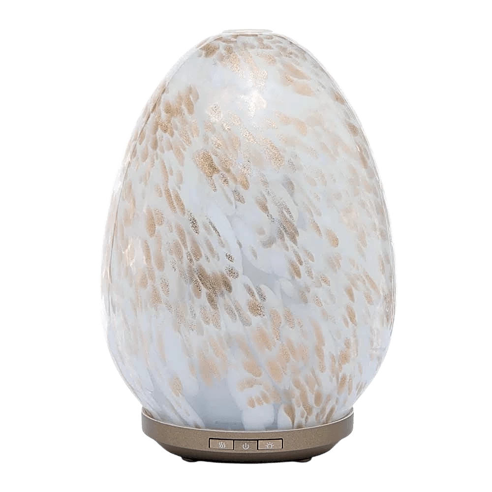 Capture the essence of the season with the April Speckle MoodMist Diffuser. Crafted from glass, its oval silhouette, adorned with white and gold speckled strokes, evokes a mesmerizing charm. This calming design rests on a luxurious gold base, while the diffuser gently releases your choise of fragrance, creating a soothing ambiance to your space.