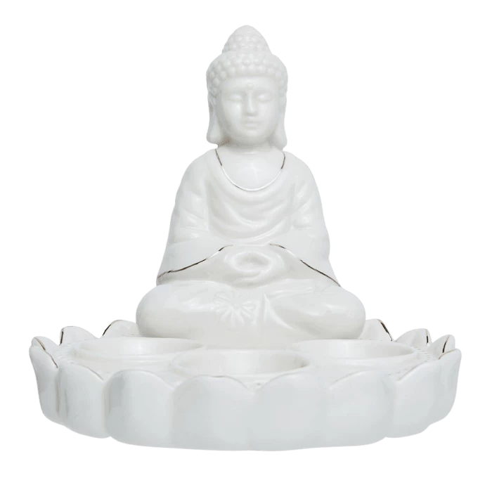 A beautiful and serene ceramic buddha tealight candle holder with white glaze finish and gold metallic paint details.