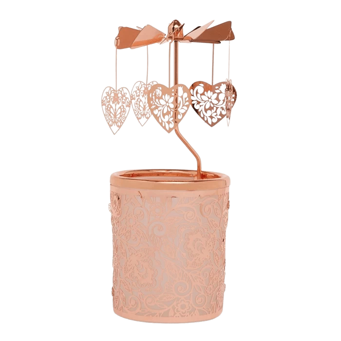 Elighten your evening with the Callie Rose Gold Tealight Spinner. Glimpse as its delicate heart and floral motifs gracefully twirl and flicker in the candle’s gentle glow.
