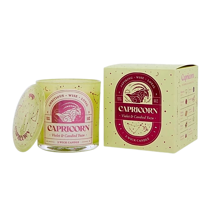 Embrace the magic and wonder of Capricorn, the grounded soul, in this exquisitely designed and crafted 2 wick scented candle as part of dusk’s Awestruck collection. Decorated in constellations, glyphs and symbols relating to this star sign, this glass jar candle with matching glass lid and one-of-a-kind packaging design is a celebration for any horoscope or astrology lover!