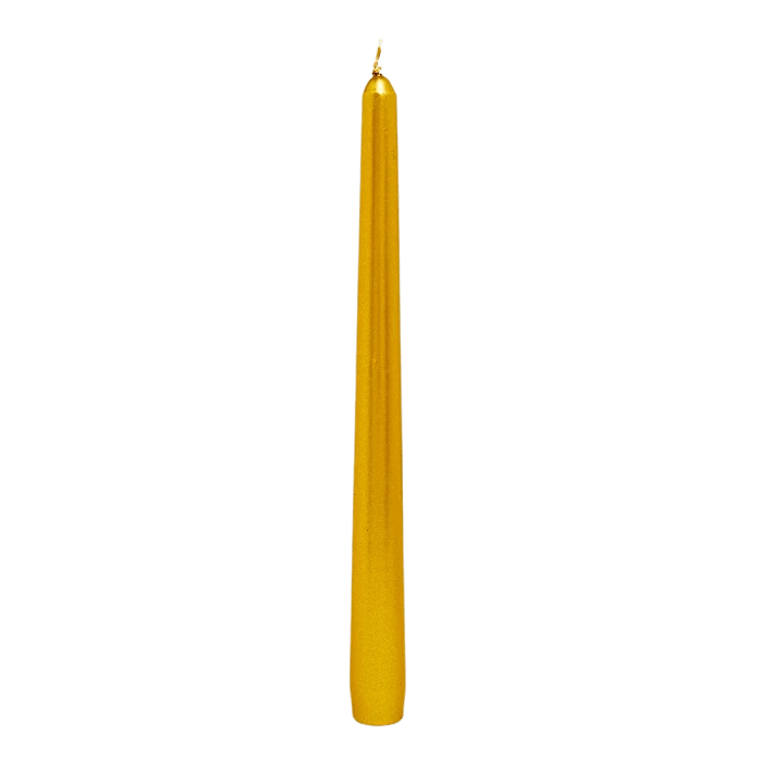 Gold Metallic Unscented Taper Candle. Burn time up to 7 hours.