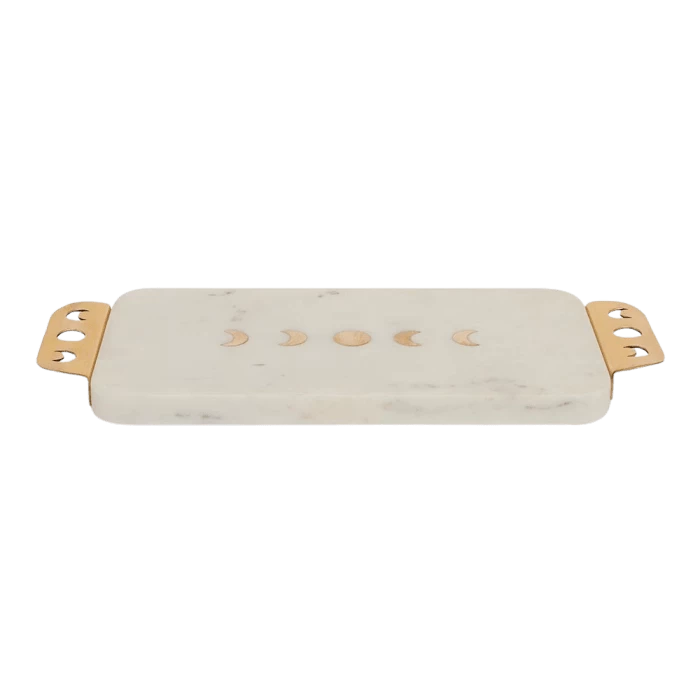 Crafted from pure, luminous marble in a timeless white hue, this tray embodies the essence of elegance. Its smooth surface invites you to run your fingers across it, while its sturdy construction ensures its longevity. But what sets this tray apart from the rest is its golden brass inlay handles, which add a touch of opulence and luxury that will leave your guests in awe.