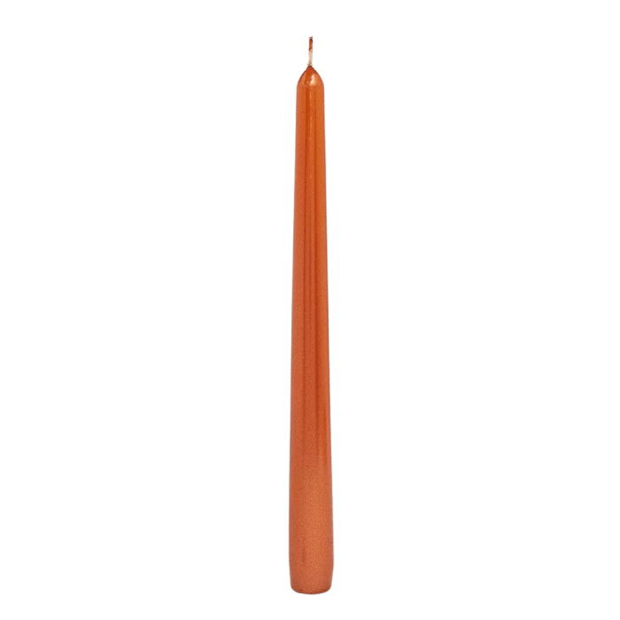 Rose Gold Metallic Unscented Taper Candle. Burn time up to 7 hours.