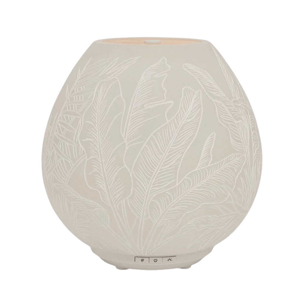 Immerse yourself in tranquility with the Tropical Plantation Resin MoodMist® Diffuser. Delicately etched, an intricate design of lush tropical palms envelops the circular resin lid, while the bamboo top adds to the organic elements. Unwind as you recollect extended sunlit days and warm, tropical nights, captivated by an enchanting interplay of illumination and a soft, subtle release of delicate fragrance.